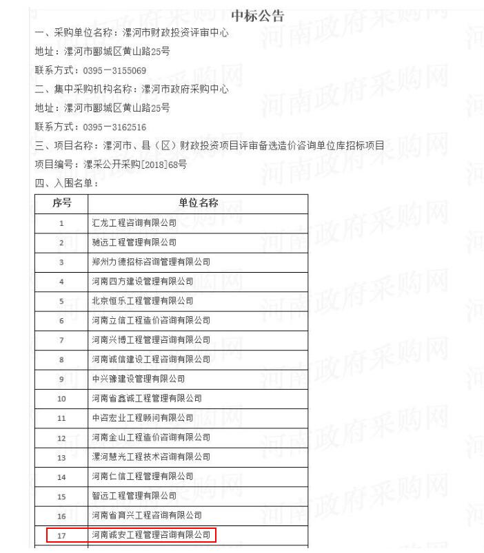 中標(biāo)啦!我公司入圍漯河市、縣(區(qū))財(cái)政投資項(xiàng)目評(píng)審備選造價(jià)咨詢單位庫(kù)招標(biāo)項(xiàng)目
