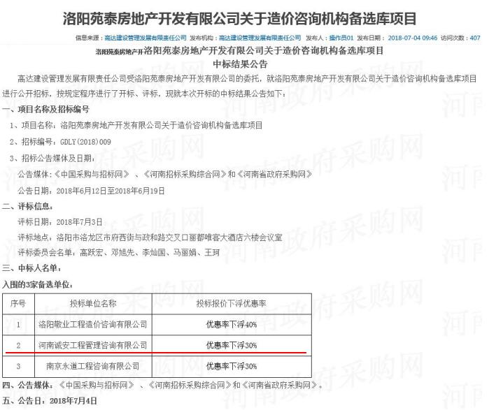 中標(biāo)啦!熱烈祝賀我公司中標(biāo)洛陽苑泰房地產(chǎn)開發(fā)有限公司關(guān)于造價咨詢機(jī)構(gòu)備選庫項(xiàng)目和輝縣市財(cái)政局市政設(shè)施小修保養(yǎng)、審計(jì)類社會中介機(jī)構(gòu)、造價咨詢中介機(jī)構(gòu)定點(diǎn)服務(wù)采購項(xiàng)目